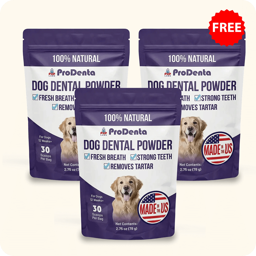 ProDenta is a natural dental health powder supplement that works from the inside out to eliminate bad breath, break down tartar cement, and support healthy gums in dogs.