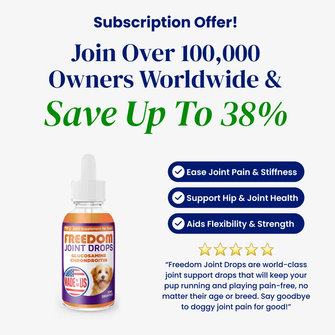 Freedom Joint Drops have been formulated to provide a powerful blend of hyaluronic acid, joint-supporting nutrients, and anti-inflammatory compounds to help restore synovial fluid and rebuild cartilage. The ingredients in these easy-to-use daily drops can support your dog's joint health and mobility, contributing to a comfortable, active, and pain-free lifestyle.